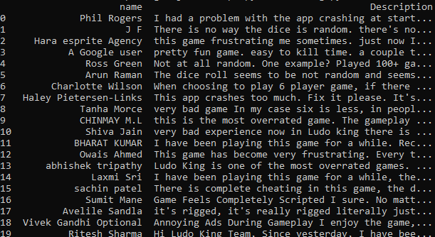 | KeyError: 'Products' | The selector didn’t match any review elements, so no data was returned. | Inspect the page with DevTools and update "selector": "div.RHo1pe" to the correct review container. |