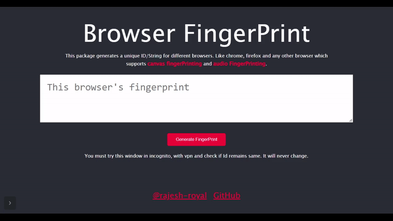 This package generates a unique ID/String for different browsers. Like chrome, Firefox or any other browsers which support `canvas` and `audio` fingerprinting. You can easily do the browser fingerprinting with this library. Its small and minimal.